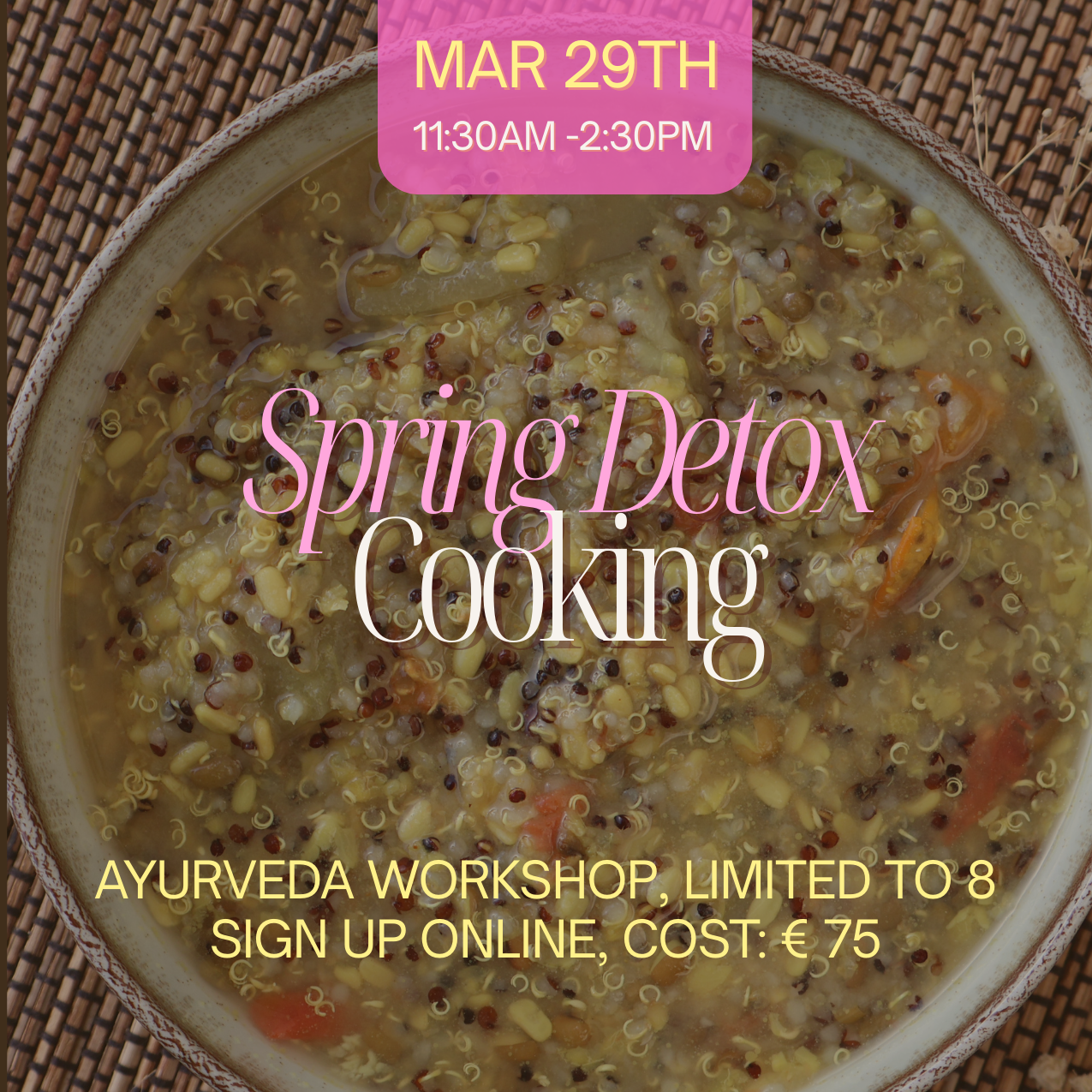 Spring is the season of renewal—a perfect time to cleanse, restore, and nourish the body through the timeless wisdom of Ayurveda. Join us for a 3-part Sunday workshop series, each session offering hands-on learning and practical tools to support your health this season.